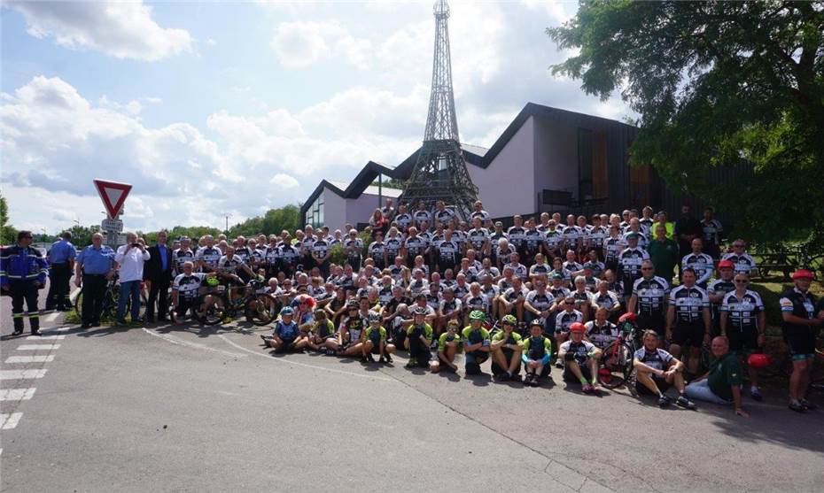 Gruppenfoto vor dem Apacher Eiffelturm, einem Nachbau des Pariser Originals im Maßstab 1:40. Foto: STUKO